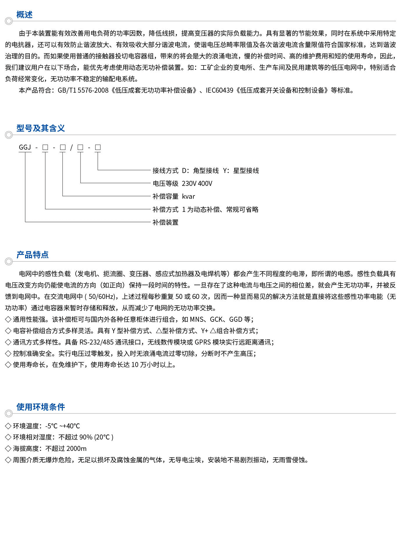 由于本装置能有效改善用电负荷的功率因数,降低线损,提高变压器的实际负载能力。具有显著的节能效果,同时在系统中采用特定的电抗器,还可以有效防止谐波放大、有效吸收大部分谐波电流,使谐电压总畸率限值及各次谐波电流含量限值符合国家标准,达到谐波治理的目的。而如果使用普通的接触器投切电容器组,带来的将会是大的浪涌电流,慢的补偿时间、高的维护费用和短的使用寿命,因此,我们建议用户在以下场合,能优先考虑使用动态无功补偿装置。如:工矿企业的变电所、生产车间及民用建筑等的低压电网中,特别适合负荷经常变化,无功功率不稳定的输配电系统。本产品符合:GB/T15576-2008《低压成套无功功率补偿设备》、IEC60439《低压成套开关设备和控制设备》等标准。