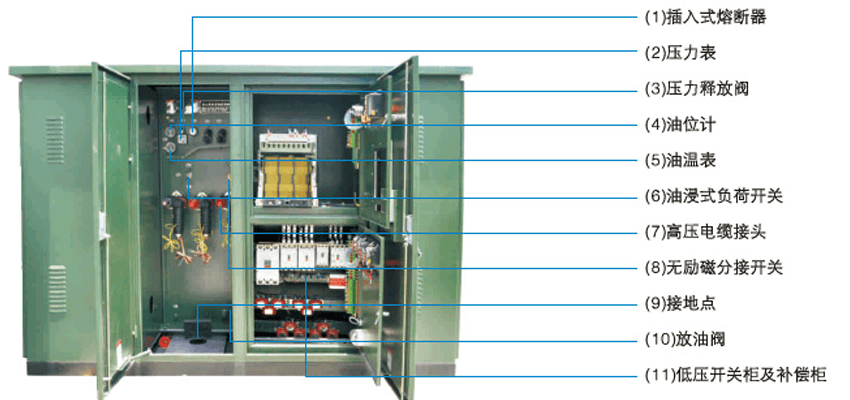 用,这就要求制造厂按不同的用户需求来设计制造,每个用户所用的供电变压器容里、开关回路多少、外围环境、布置方式等均有差异。由于变压器安装在户外的箱体中,户